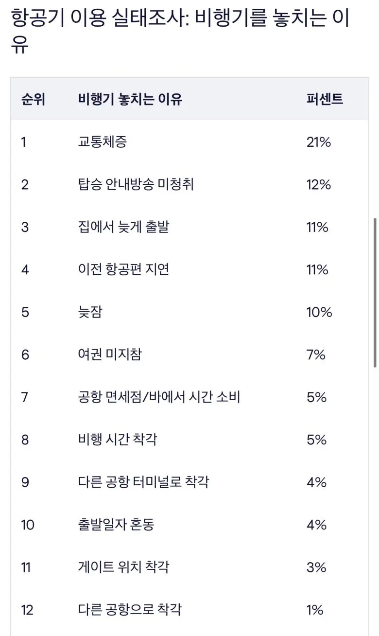 비행기를 놓치는 이유 통계