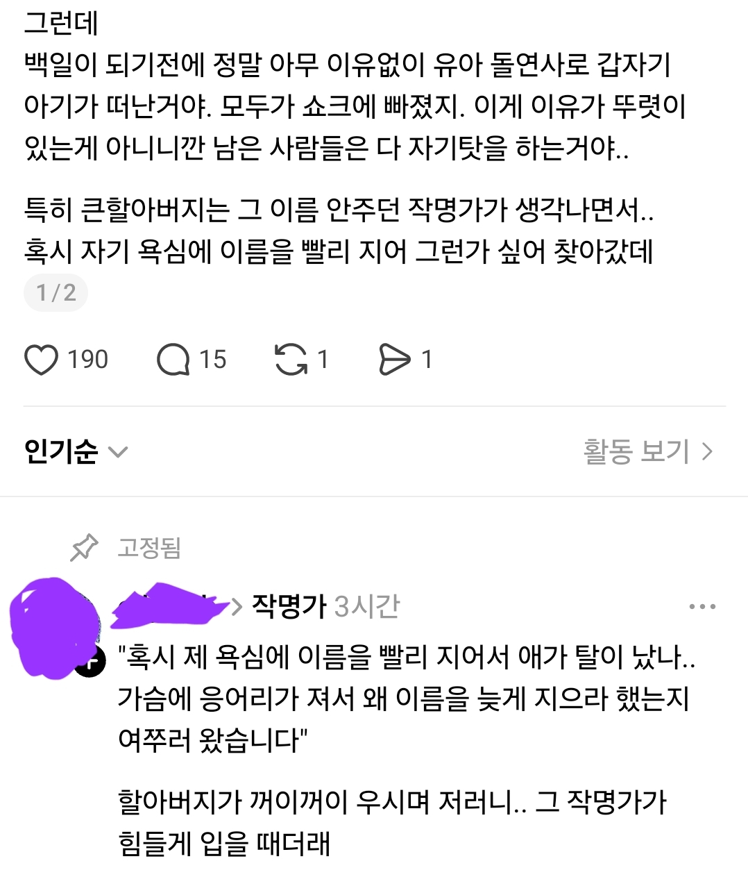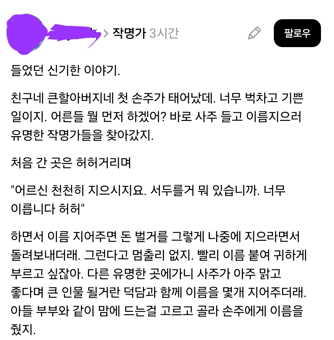 친구네 큰할아버지네 첫 손주가 태어났데. 바로 사주 들고 이름지으러 유명한 작명가들을 찾아갔지. - 유머스레드