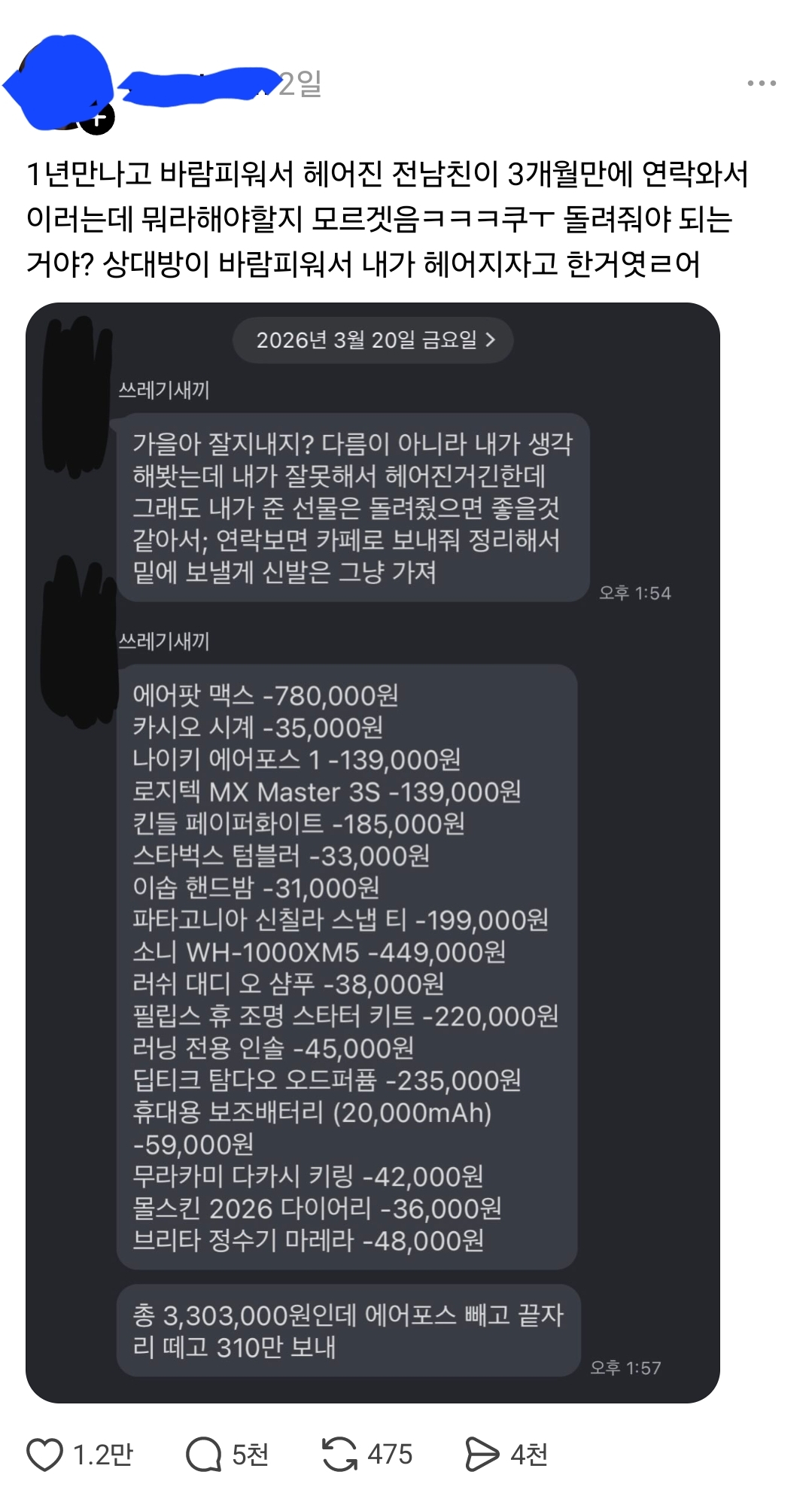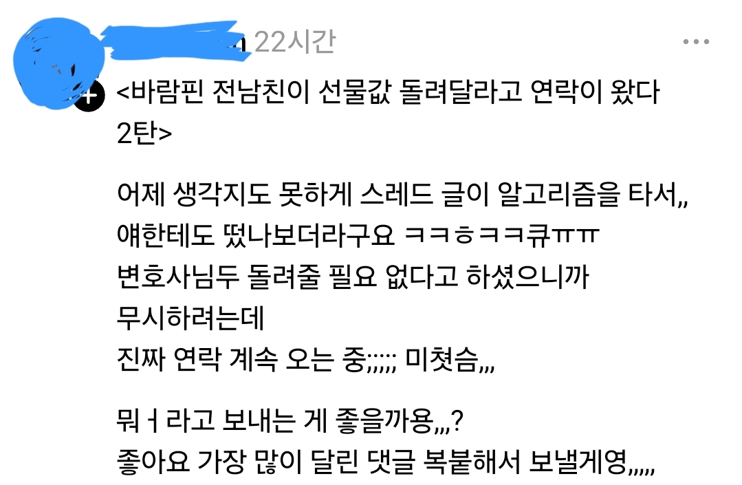 1년만나고 바람피워서 헤어진 전남친이 3개월만에 연락와서
